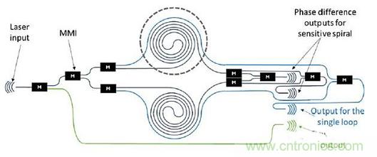 改進后的MOM壓力傳感器設計,MZI是平衡的;第一個是大范圍測量用單回路,第二個將敏感螺旋臂中的信號分成兩路去相位輸出,這樣就能始終對每一壓力進行靈敏測量(圖3)。