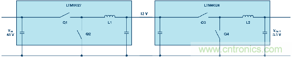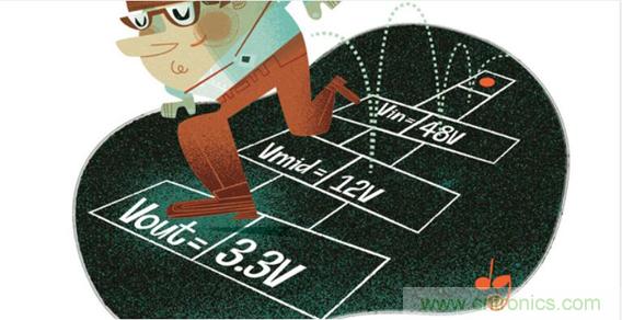 圖2.電壓分兩步從48 V降至3.3 V,包括一個(gè)12 V中間電壓。