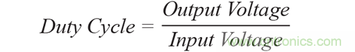 如果將一個(gè)降壓轉(zhuǎn)換器(降壓器)用于此單一轉(zhuǎn)換步驟,如圖1所示,會(huì)出現(xiàn)小占空比的問(wèn)題。占空比反映導(dǎo)通時(shí)間(當(dāng)主開(kāi)關(guān)導(dǎo)通時(shí))和斷開(kāi)時(shí)間(當(dāng)主開(kāi)關(guān)斷開(kāi)時(shí))之間的關(guān)系。降壓轉(zhuǎn)換器的占空比由以下公式定義: