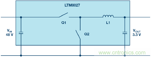 圖1.通過(guò)單一轉(zhuǎn)換步驟將電壓從48 V降至3.3 V。