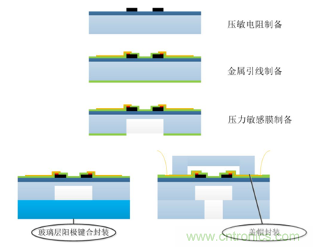 SOI高溫壓力傳感器的制備工藝涉及多道MEMS工藝,此處簡單介紹一些關鍵步驟以供了解傳感器的工藝過程,如圖3所示,主要包括壓敏電阻制備、金屬引線制備、壓力敏感膜制備以及壓力腔封裝等工藝。