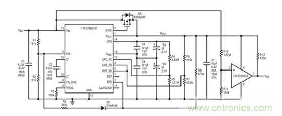 電容器具有緊湊、堅固和可靠的特點,并能支持用于應(yīng)對短期掉電過程中后備系統(tǒng)的電源要求。與電池相似,它們也需要在輸出端進(jìn)行謹(jǐn)慎的充電和功率調(diào)節(jié)。LTC®3226 是一款具有一個電源通路 (PowerPath™) 控制器的兩節(jié)串聯(lián)超級電容器充電器,可簡化后備系統(tǒng)的設(shè)計。特別地,該器件包含一個具可編程輸出電壓和自動電池電壓平衡功能的充電泵超級電容器充電器、一個低壓差穩(wěn)壓器和一個用于實現(xiàn)正常模式與后備模式之間切換的電源故障比較器。低輸入噪聲、低靜態(tài)電流和緊湊的占板面積使 LTC3226成為緊湊、手持和電池供電型應(yīng)用的理想選擇。這款器件采用3mm x 3mm 16引腳QFN封裝。