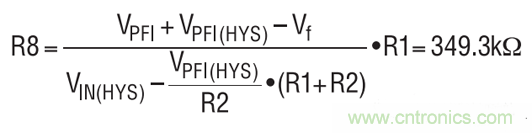VIN 引腳上的遲滯必需延長以滿足 3.6V 的觸發(fā)電平。這可以通過在 PFI 引腳和 PFO 引腳之間增設(shè)一個電阻器與二極管的串聯(lián)組合來實現(xiàn)。VIN(HYS) 為0.5V,VPFI(HYS)為20mV,而Vf為0.4V。
