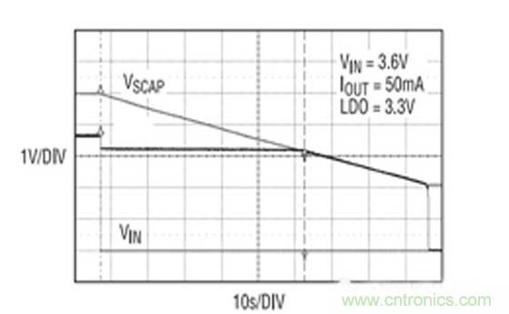 每個超級電容器均選擇為一個由 Nesscap 公司提供的3F/2.7V電容器(ESHSR-0003C0-002R7)。圖 2 示出了在具有一個 50mA 負(fù)載時系統(tǒng)的實際后備時間。由于在實際電路中使用了較大的 3F 電容器,因此后備時間為55.4s。