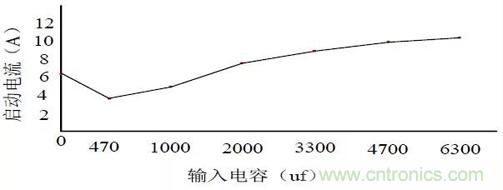從理論上講,增大電路中的濾波電容 C容量的確可以使輸出電壓的波形變得更為平滑、起伏更小,但在電路接通瞬間,電路中所產(chǎn)生的沖擊電流因素卻不能被忽略;在一些濾波電路的維修中對(duì)濾波電容的替換也存在沖擊電流的問(wèn)題,在不更換其他元件的前提下,單純提高濾波電容的容量會(huì)使整個(gè)電路的實(shí)際使用壽命大大縮短,甚至燒毀整個(gè)電路。況且,單純地提高濾波電容的容量對(duì)改善輸出電壓的作用也是有限的。做一個(gè)簡(jiǎn)單實(shí)驗(yàn)外接不同輸入電容的大小啟動(dòng)時(shí)的電流曲線,如下圖所示為輸入外接電容大小與啟動(dòng)電流的關(guān)系曲線。