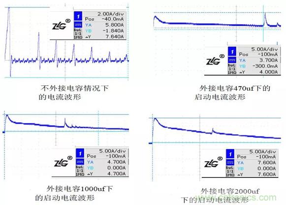上圖為外接電容大小不同的啟動(dòng)電流波形。外接電容在一定情況下,啟動(dòng)電流達(dá)到最低值,對(duì)整個(gè)電路的輸入,輸出環(huán)境有很大的改善。當(dāng)外接電容超過(guò)這個(gè)范圍就會(huì)導(dǎo)致啟動(dòng)電流增大,對(duì)其他器件的威脅也就隨之增大,導(dǎo)致出現(xiàn)不同程度的器件損壞。