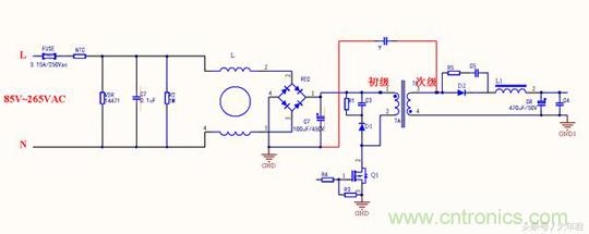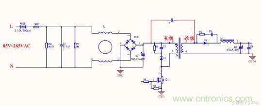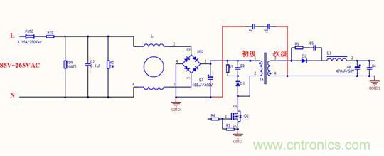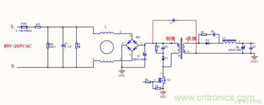 變壓器的每個線圈繞組之間有寄生電容存在,在工作時過程當中形成電壓,成為噪聲源頭,在初始高壓與次級地之間跨接Y電容,能濾除初級和次級耦合產生的共模干擾,這與第一種差不多,只是在EMI測試時候結果會有所不同。