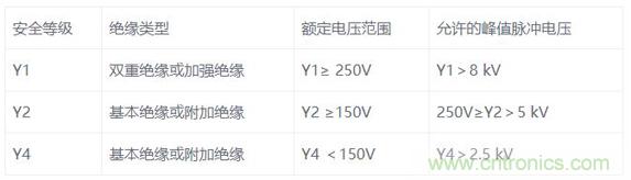 我們都知道Y電容是安規電容,是跨接L線地以及N線與地之間的電容,它的作用是抑制共模干擾。現在一共有三種等級,分別是是Y1, Y2, Y4。由于漏電流不能太大這是安規要求,漏電流太大人體觸摸用電器會有一種麻麻的感覺,因此一般Y電容容量大小為1nF到4.7nF之間。