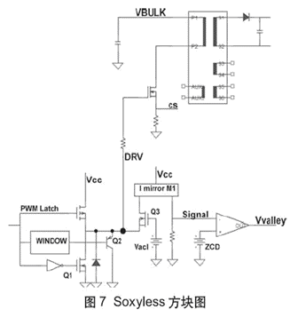 Soxyless模塊的主要功能為:啟動PNP;禁用推挽驅動器的下部NFET;在漏極電壓振蕩的負dV/dt部分在驅動器輸出DRV上形成“虛擬地”;捕獲(流出DRV輸出端的)負電流;檢測“正向ZCD DRV電流”。