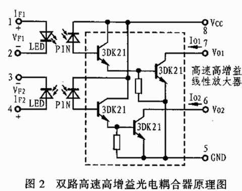 近幾年來,國內有關單位投入大量人力物力也研究和開發了各種光電耦合器件。如上海半導體器件八廠、上海無線電十七廠等。而重慶光電技術研究所為了適應市場需要研制出了一種由高速響應發光器件和邏輯輸出型光接收放大器組成的厚膜集成雙路高速高增益電耦合器。這種光電耦合器的輸入端由兩只GaAIAs側面發光管組成,其輸出端由兩只Si—PIN光電探測器以及兩個高速高增益線性放大電路組成。圖2所示為其原理電路圖,除此之外,重慶光電技術研究所還研制出了高速高壓光電耦合器、GG2150I型射頻信號光電耦合器、GG2060I型高壓脈沖測量光電耦合器、GH1204U型高壓光傳輸光電耦合器以及 GH1201Y型和GOHQ-I型光電耦合器等。