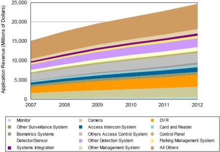2007-2012年,住宅應用的市場份額預計將從18.8%升至22.1%。同期政府在安防方面的支出將會下降。但是,用于監控交通與零售店的視頻監視增長較快,將推動中國安防市場的增長。安防系統在制造業的滲透率較高,預計未來在該領域的增長將會放緩。