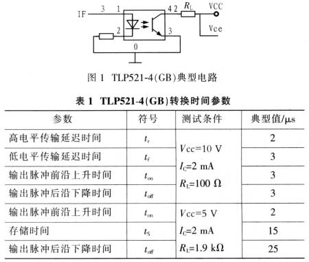 通常情況下,單芯片集成多路光耦的器件速度都比較慢,而速度快的器件大多都是單路的,大量的隔離器件需要占用很大布板面積,也使得設計的成本大大增加。在設計中,受電路板尺寸、傳輸速度、設計成本等因素限制,無法選用速度上非常占優勢的單路光耦器件,在此選用TOSHIBA公司的TLP521-4。