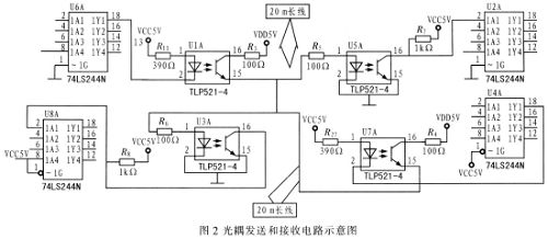 采用光電隔離器TLP521-4對發送和接收設備進行電氣隔離,對于減小交流阻抗的作用十分明顯,進而增大傳輸電流,有效地抑制地線噪聲;同時由于74LS244N的應用。總線驅動能力得到保障。圖2為光耦發送和接收電路示意圖。圖2中,上半部兩光耦自左向右傳輸信號,下半部兩光耦自右向左傳輸信號,左端74LS244N通過靜態存儲器IDT7132與處理器進行數據交換,右端通過8255與處理器進行數據交換。