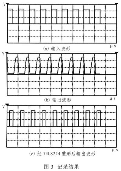 調試中,輸入周期為100μs,占空比為1/2的+5V方波,對一路光耦的輸入端波形和經過20m長線后接收光耦的輸出端波形以及經過74LS244整形后的波形進行記錄。記錄結果如圖3所示。
