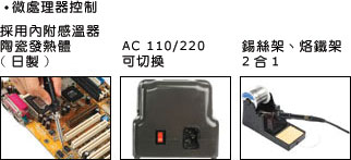采用精密CPU數(shù)位控溫電路, 和日本進(jìn)口陶瓷發(fā)熱體, 精準(zhǔn)控制溫度200~480ºC, 整體防靜電結(jié)構(gòu), 輸入電壓AC 110V/220V可切換, 配合安全回路保護(hù), 流線可堆疊外型, 開關(guān)前置、斜面無視角差, 適合各種環(huán)境使用焊臺(tái)、烙鐵架分離設(shè)計(jì), 并具有錫絲架功能、使用便利.
