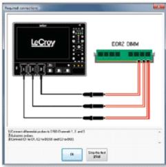 QPHY-DDR2的操作非常簡單,如右圖所示,它使用友好的圖形化界面引導用戶從探頭與被測系統連接開始一步步完成DDR2的所有測試。目前為止,力科DDR軟件包是能支持的測試項目最多的。