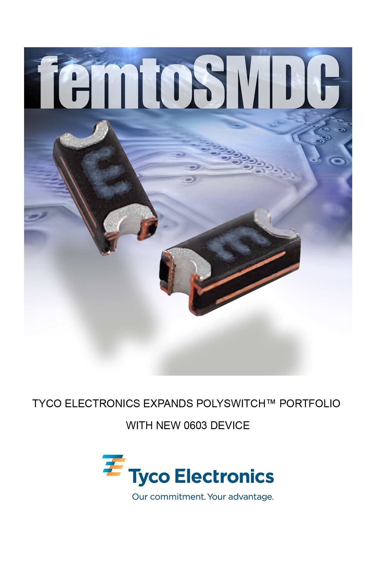 泰科電子(Tyco Electronics)今天宣布其廣受歡迎的表面貼裝PolySwitch™器件系列再添一款符合行業(yè)標(biāo)準(zhǔn)的新型0603器件。femtoSMDC016F器件的占板面積不到上一代器件的一半,并且有助于保護(hù)敏感電子電路免受過流及過溫事故的損壞。該器件的快速動(dòng)作時(shí)間和可復(fù)位功能可幫助制造商降低保修費(fèi)用和提高各種便攜式電子產(chǎn)品的可靠性,比如以下產(chǎn)品: