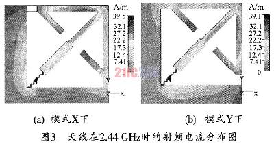 [page]由于兩種工作狀態下,天線的接地端不同,因此,天線的有效輻射部分也有所不同。當處于X模式時,天線結構中垂直部分的微帶線接地,因此,天線的輻射部分應該為水平部分的微帶,天線也相應工作在水平極化方式。圖3所示為天線在2.44GHz時的射頻電流分布圖。