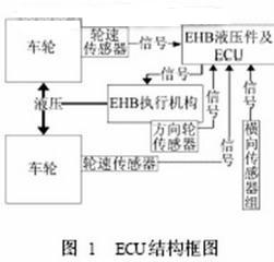 在中小型車(chē)輛的傳統(tǒng)制動(dòng)系統(tǒng)中,駕駛員通過(guò)制動(dòng)主缸在輪缸建立制動(dòng)壓力,而EHB則是通過(guò)蓄能器提供制動(dòng)壓力。蓄能器壓力由柱塞泵產(chǎn)生,可提供多次連續(xù)的制動(dòng)壓力。EHB由傳感器、ECU及執(zhí)行器(液壓控制單元)等構(gòu)成,其結(jié)構(gòu)如圖1所示。