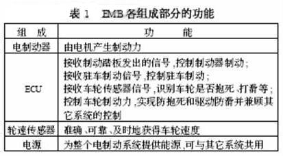 EMB主要用于小型車(chē)輛中,主要包含電制動(dòng)器、ECU、輪速傳感器、動(dòng)力電源等。它與EHB最大區(qū)別是制動(dòng)力為電機(jī)提供的轉(zhuǎn)矩,而不是由柱塞泵產(chǎn)生的高壓油,且有獨(dú)立的電源來(lái)供電,其各部分的功能如表1。