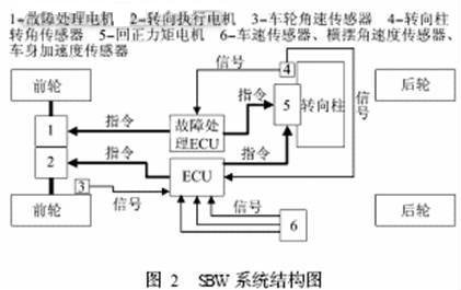 SBW的工作原理是當(dāng)轉(zhuǎn)向盤(pán)轉(zhuǎn)動(dòng)時(shí),轉(zhuǎn)向傳感器和轉(zhuǎn)向角傳感器將測(cè)量到的駕駛員轉(zhuǎn)矩和轉(zhuǎn)向盤(pán)的轉(zhuǎn)角轉(zhuǎn)變成電信號(hào)輸入到ECU,ECU依據(jù)車(chē)速傳感器和安裝在轉(zhuǎn)向傳動(dòng)機(jī)構(gòu)上的位移傳感器的信號(hào)來(lái)控制轉(zhuǎn)矩反饋電動(dòng)機(jī)的旋轉(zhuǎn)方向,并根據(jù)轉(zhuǎn)向力模擬,生成反饋轉(zhuǎn)矩,控制轉(zhuǎn)向電動(dòng)機(jī)的旋轉(zhuǎn)方向、轉(zhuǎn)矩大小和旋轉(zhuǎn)角度,通過(guò)機(jī)械轉(zhuǎn)向裝置控制轉(zhuǎn)向輪的轉(zhuǎn)向位置,使汽車(chē)沿著駕駛員期望的軌跡行駛。