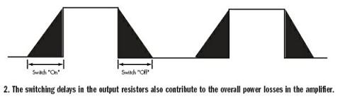 D類輸出晶體管在一個從全“開”到全“關”的開關模式下運行,在線性區域花費很少的時間,所以用于熱損耗的功率非常少。如果晶體管的電阻很低,通過它們的壓降小,會更進一步地降低功耗。