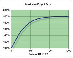 如果R1和R2的阻值不同,那么電壓輸出的誤差將逼近固有的電阻容差的兩倍,如圖3所示。分壓器設計的最壞情況出現在兩個電阻的容差正好相反時。如果分壓器的設計采用了容差為±0.1%的電阻,那么在此比率下輸出誤差最壞可達±0.2%。
