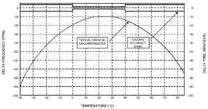 圖2補償和未補償晶體振蕩器的頻率與溫度關系曲線