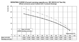 額定電流,是促使母端子特定升溫的電流量,一般為20℃或30℃。要正確使用這數據,除了須了解其測試方法,也須留意其測試環境。例如:有些單純測試一對相接卻沒有安裝在外殼內的母端子及公針。眾所周知,影響連接器的升溫的因素,包括接觸電阻、電流量及散熱渠道。在實際應用時,公針母端子是安裝在外殼內的。因此,散熱渠道劇減。再加上一般同時使用多個接觸對,更不能以額定電流峰值設置為連接器的工作電流。