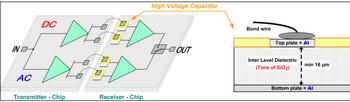 圖2的右側顯示了一個高壓電容器的橫截面。從發送器芯片出來的接合線連接到接收機端電容器鋁頂板。底板(也為鋁質)連接到接收機邏輯。板之間是夾層電介質,其為16-μm厚的二氧化硅(SiO2)層。