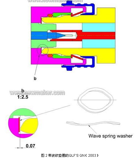 1) 這個設計巧妙地把彈簧片設置在公頭外導體后部,讓公母頭的外導體端面之間實現剛性接觸,從而達到端面零間隙,完全符合平面接頭的設計原則,使接頭性能得到較大提高,這與QN 把簧片設置在兩外導體端面之間相比,顯然是一個進步。