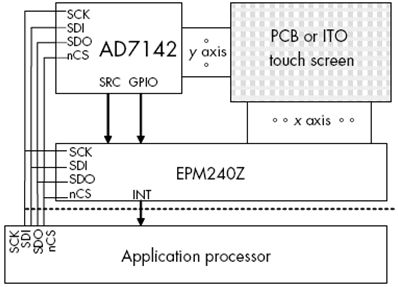 參考設計有一個簡單的數據解釋程序,演示并測試多觸點傳感器的工作。AD7142 CDC用于監測電容變化,只有14個電容傳感器通道。在這一參考設計中,MAX IIZ CPLD擴展了AD7142 CDC的功能,使其能夠處理兩維ITO薄膜和PCB觸摸傳感器。應用處理器通過SPI或者I2C總線訪問AD7142的CDC寄存器文件,將MAX IIZ CPLD的SRC信號控制設置在合適的軸上。長時間暫停后,觸摸屏監測到一次觸摸時,MAX IIZ CPLD會產生一個中斷信號。