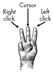 圖1(b)中的傳感器可實現計算導航板,從而避免了使用普通導航板所需要的選擇按鈕。如圖2所示,中指移動光標,食指和無名指觸摸屏幕,指示鼠標左鍵或者右鍵點擊。去掉移動部分后,電容觸摸屏傳感器比按鍵和按鍵開關更耐用。