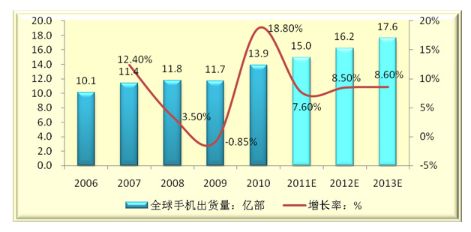- 預計2010-2013年全球手機出貨量將保持7%以上的增速