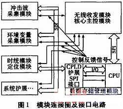無線傳感器網絡節點采用模塊化的設計方法,每個節點包括無線收發模塊、核心主控模塊和功能模塊。系統通過無線收發模塊接收主站發送的命令碼,核心主控模塊對命令解碼,完成對各功能模塊的控制(開啟采集、時統清零等)。系統要完成多次重復性試驗,因此每次試驗完畢要把實驗數據(沖擊波數據、環境變量信息、時統跟定位信息等)存儲到數據存儲管理模塊統一管理,同時準備下次試驗。系統工作時,數據儲存管理模塊SPI接口一方面工作在從模式,接收主控模塊發送的命令;另一方面工作在主模式,轉發控制其他功能模塊的命令碼并讀取試驗數據進行統一管理,圖1為在其內擴展專用工作在主模式下的SPI接口的模塊問鏈接圖。專用工作在主模式下的SPI接口電路,具有提高模塊間數據傳輸速度與靈活性等特點。