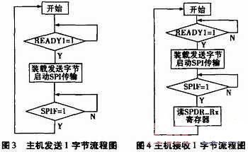 (2)軟件部分:單片機為主控制器,首先查詢從機狀態標志位READY是否為1,判斷是否可以與從機通信。從機準備就緒時,單片機可裝載1字節發送數據,啟動CPLD內部SPI接口電路,查詢并等待SPI傳輸結束標志位SPIF為1,完成一字節數據傳輸,如此重復。圖3、圖4為主機發送與接收1字節流程圖。