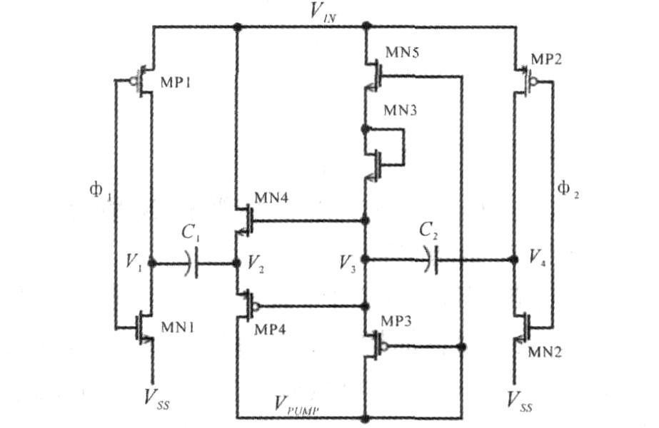 自舉電荷泵不需要為MN2和MP2提供柵驅(qū)動(dòng)電壓,控制簡(jiǎn)單,但輸出電壓會(huì)有一個(gè)閾值損失。圖3是改進(jìn)后的電荷泵電路圖,1和2為互補(bǔ)無(wú)交疊時(shí)鐘。由MN2、MN5、MP3、MP2和電容C2組成的次電荷泵為MN4、MP4提供柵壓,以保證其完全關(guān)斷和開啟。當(dāng)1為低電平時(shí),MP1導(dǎo)通,電位增加,此時(shí),V3電位為零,MP4導(dǎo)通,V2上的電荷轉(zhuǎn)移到柵電容CGATE上,VPUMP電位升高。當(dāng)1為高電平時(shí),MP2導(dǎo)通,為C2充電,V4電位上升至電源電位,V3電位隨之上升,MP3導(dǎo)通,VPUMP電位繼續(xù)升高。MN3相當(dāng)于二極管,起單向?qū)щ姷淖饔谩?br />