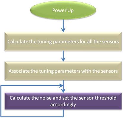 在自調試電容式感應系統中,可用多種算法來實現觸摸感應系統?;旧蟻碚f,電器自調試和手動調試沒有什么不同。如圖7所示,有些任務一上電就會執行完畢(一次補償),而有些必須不斷執行(動態補償)。