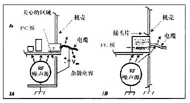 使共模電流注入到I/O區(qū)的另一機(jī)理,是附近有強(qiáng)的干擾源的耦合。甚至有些“屏蔽”連接器也無用,因?yàn)楦蓴_源就在連接器附近,如PC機(jī)環(huán)境。如果在連接器和底板之間有一個(gè)缺口,此處所感應(yīng)的RF電壓可以使EMC性能下降(圖1B)。