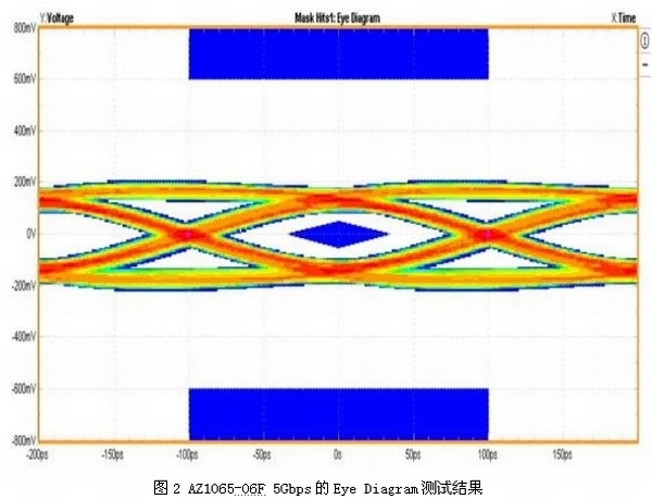 在IEC 61000-4-2接觸模式6kV(TLP電流等效約為17A)的ESD攻擊下,箝制電壓僅有13.4V,足以有效避免系統(tǒng)產(chǎn)品在靜電測(cè)試時(shí)發(fā)生數(shù)據(jù)錯(cuò)誤、當(dāng)機(jī)甚至損壞的情況。圖2所示為裝有ESD保護(hù)組件AZ1065-06F的USB 3.0端口順利通過(guò)5Gbps的眼圖測(cè)試結(jié)果。