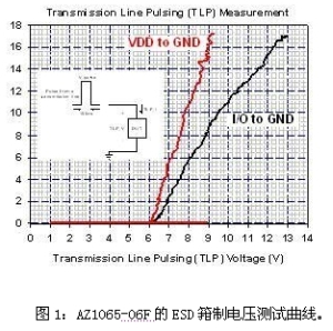 最重要是,與相同的寄生電容相比,AZ1065擁有最低的ESD箝制電壓,可有效防止數(shù)據(jù)傳輸時(shí)被ESD事件干擾,這樣才能讓具有USB 3.0連接端口的電子系統(tǒng)得以通過(guò)Class-A的IEC 61000-4-2系統(tǒng)級(jí)靜電放電保護(hù)測(cè)試。利用傳輸線脈沖系統(tǒng)(TLP)測(cè)量AZ1065-06F后,可以觀察到如圖1所示的ESD箝制電壓特性。