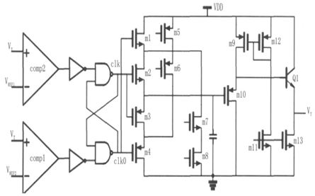 本文采用的三角波產(chǎn)生電路結(jié)構(gòu)如圖6 所示,其中m5、m6 和m7、m8 構(gòu)成了兩組恒流源,m9~m13 和Q1 構(gòu)成了輸出級。在電路中,采用將輸出信號(hào)VT 分別反饋到比較器comp1 和comp2,與參考電平VREF1 和VREF2(VREF2<VREF1)進(jìn)行比較,并通過一組數(shù)字電路產(chǎn)生兩路反向的時(shí)鐘信號(hào)clk 與clk0,來控制m2 和m3 的開啟和關(guān)斷,從而達(dá)到對電容C 進(jìn)行充放電,產(chǎn)生三角波信號(hào)VT 的目的。