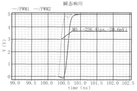 驅(qū)動(dòng)電路結(jié)構(gòu)如圖8 所示,該電路能有效調(diào)節(jié)死區(qū)時(shí)間(N 型、P 型功率開關(guān)管同時(shí)關(guān)斷),防止單臂"shoot- through"現(xiàn)象,并有保護(hù)關(guān)斷功能。輸入信號(hào)為比較器輸出的PWM 脈沖信號(hào),PWM1用來驅(qū)動(dòng)N 型功率開關(guān)管,PWM2 用來驅(qū)動(dòng)P 型功率開關(guān)管。為了避免全橋開關(guān)電路中的單臂"shoot- through"現(xiàn)象,當(dāng)PWM 信號(hào)從低電平變?yōu)楦唠娖綍r(shí),PWM2 應(yīng)首先變?yōu)楦唠娖剑?關(guān)斷PMOS 功率開關(guān)管,隨后PWM1 再變?yōu)楦唠娖剑_啟NMOS 功率開關(guān)管,如圖9 所示;反之,當(dāng)PWM 信號(hào)從高變?yōu)榈蜁r(shí),PWM1 先變?yōu)榈碗娖?,關(guān)斷NMOS 開關(guān)功率管,隨后PWM2 再變?yōu)榈碗娖剑_啟PMOS 開關(guān)功率管。實(shí)際電路中,可以根據(jù)需要通過控制延遲單元的控制位Tc 來調(diào)整死區(qū)時(shí)間的長短。為減小失真,必須減小死區(qū)時(shí)間,該驅(qū)動(dòng)電路采用了逐級增加驅(qū)動(dòng)能力的方式來驅(qū)動(dòng)功率管,從而減小了必要的死區(qū)時(shí)間,保證了低失真度。