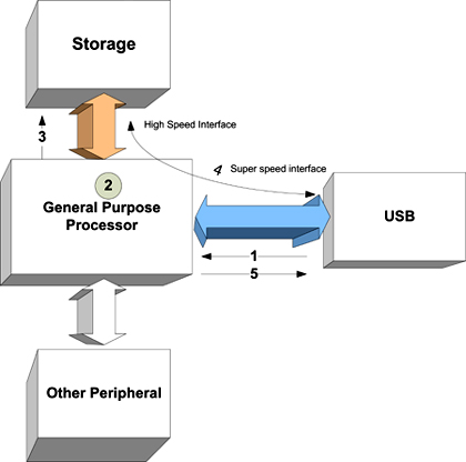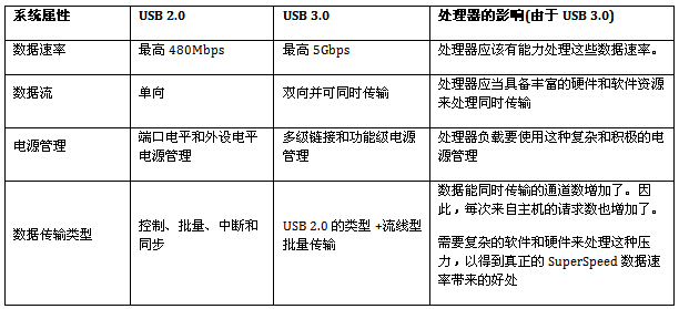 在一個普通的場景中,在device端,處理器直接連接到USB、存儲器和外設。記住這種結構,由High-Speed過渡到SuperSpeed,處理 器的影響可以概括如下: