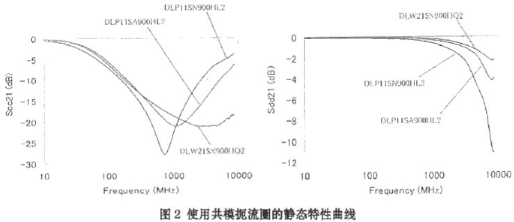 現在把共模扼流圈在信號線上和時鐘線上測試其噪音并因此確定受到的影響。在1080p或12位深色的最高信號頻率為1.11GHz上,對數據傳輸進行評價。圖2所示為共模轉換特性,特別是Scc21,在此消除的噪音但增加了與其成比例的Scc21的量值,以及差分模式傳輸特性和影響信號波形跌幅成比例的Sdd21。在此采用共模扼流圈進行評價。