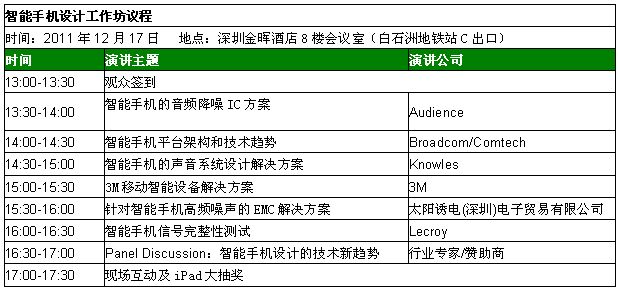 HTC、SAMSUNG、LG、SHARP、AT&T、SK Telecom、PANTECH、DoCoMo 等手機(jī)設(shè)計(jì)領(lǐng)軍廠商在智能市場(chǎng)領(lǐng)域的競(jìng)爭(zhēng)非常激烈,他們都用到哪些技術(shù)?由我愛方案網(wǎng)(www.52solution.com)、電子元件技術(shù)網(wǎng)(m.yttele.cn)和China Outlook Consulting主辦的首屆智能手機(jī)設(shè)計(jì)工作坊(Smart Phone Design Workshop)將于2011年12月17日下午在深圳金暉酒店8樓會(huì)議室隆重召開!為您Hold 住 2012 智能趨勢(shì),給力手機(jī)開發(fā)設(shè)計(jì)!