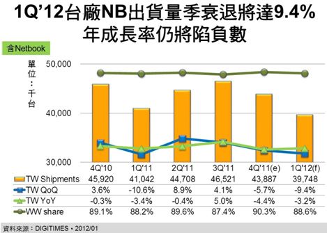 2012年第1季進入歐美傳統(tǒng)淡季,亞洲傳統(tǒng)旺季需求亦不甚熱絡(luò),加上硬盤缺貨在1月最為嚴重,2月之后雖可逐月顯著改善,但英特爾(Intel)新CPU Ivy Bridge NB 4月上市在即,臺廠于3月即將開始大量出貨,致使1月硬盤未能滿足的舊CPU NB訂單將不具補單意義,進而造成臺廠NB出貨量將再較上季衰退9.4%。也由于全球景氣不振,NB市況持續(xù)低迷,DIGITIMES Research資深分析師兼主任簡佩萍預估,第1季臺廠NB出貨量將再較2011年同期衰退3.2%,致使連續(xù)兩年第1季臺廠NB出貨量年成長率均為負值。