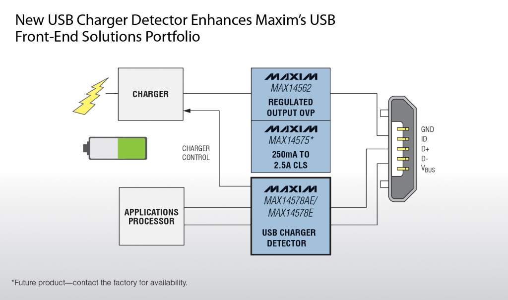 Maxim Integrated Products, Inc 于近日推出業(yè)內(nèi)尺寸最小、符合USB電池充電規(guī)范的USB電池充電檢測器MAX14578E/MAX14578AE。除了可以檢測Apple和Sony專有充電器適配器外,該系列器件還可以檢測USB標(biāo)準(zhǔn)下行端口(SDP)、USB充電下行端口(CDP)或?qū)S贸潆娖鞫丝?DCP)。一旦檢測到充電端口,MAX14578E/MAX14578AE將控制外部鋰離子(Li+)電池充電控制器,以優(yōu)化充電時間和充電效率。