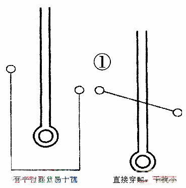 通常低電平、高阻抗端導線容易受干擾,布線時應越短越好:輸入、輸出端用的導線應盡量避免相鄰平行,最好加線間地線,以免發(fā)生反饋耦合。平行線效應與長度成正比,按信號去向順序布線,忌迂回穿插。遠離干擾源,盡量遠離電源線,高電平導線:實在躲不開干擾源時,不能與之平行走線,雙面板交又通過,單面板飛線過渡。如圖1所示。