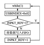 下面以IN端點2為例,說明數據如何通過USB接口傳遞到電腦上。當電腦發出IN請求時,如果USB端點2的FIFO非空,就向電腦發送FIFO里的內容;如果FIFO為空,則向電腦發送一個空包作為回應。CC2531通過寄存器位USBCSIL.INPKT_RDY來控制電腦和8051 MCU內核對USB的FIFO的使用權。當INPKT_RDY=1時,電腦正在對USB端口進行訪問,8051 MCU內核無法向FIFO內寫入數據;當INPKT_RDY=0時,8051 MCU內核可以將發送數據寫入FIFO內,置位INPKT_RDY=1,完成數據的上傳。其流程如圖4所示。